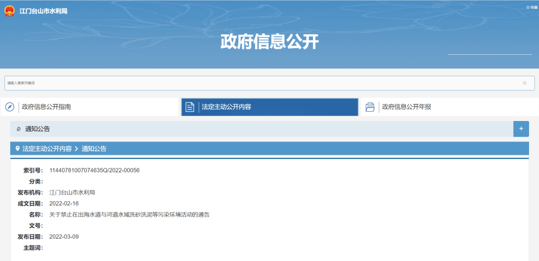 關(guān)于禁止在出海水道與河道水域洗砂洗泥等污染環(huán)境活動(dòng)的通告