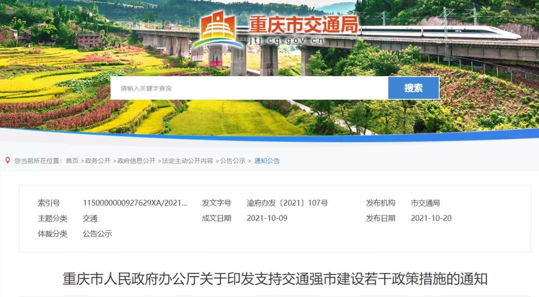 近日,重慶市印發(fā)《支持交通強市建設若干政策措施》,文件不僅明確“十四五”期間安排市級財政資金1150億元,統(tǒng)籌用于高速鐵路、高速公路、普通國省干線公路、民航、水運以及支持鄉(xiāng)村振興的農(nóng)村公路等交通基礎設施建設。