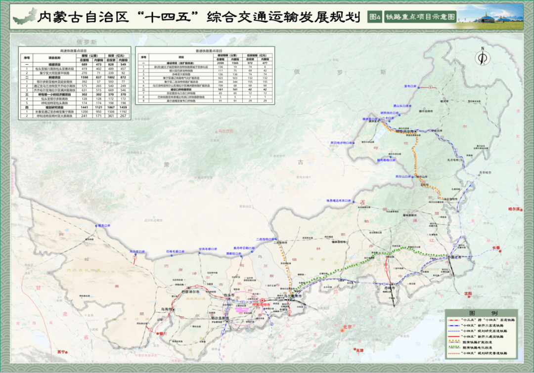 根據(jù)規(guī)劃里的綜合交通網(wǎng)絡(luò)建設(shè)項(xiàng)目表,內(nèi)蒙古十四五期間將推進(jìn)9條高鐵重點(diǎn)項(xiàng)目,總里程4030公里,總投資4855億元。其中:續(xù)建2條,新建3條,呼包鄂一小時經(jīng)濟(jì)圈2條,規(guī)劃研究2條。