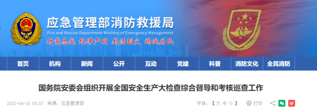 根據(jù)黨中央、國務(wù)院決策部署和全國安全生產(chǎn)大檢查工作安排,自4月中旬至6月底,國務(wù)院安委會(huì)組織16個(gè)綜合檢查組,對31個(gè)?。ㄗ灾螀^(qū)、直轄市)和新疆生產(chǎn)建設(shè)兵團(tuán)安全生產(chǎn)大檢查情況進(jìn)行綜合督導(dǎo),并同步開展國務(wù)院2021年度省級(jí)政府安全生產(chǎn)和消防工作考核巡查及國務(wù)院安委會(huì)成員單位安全生產(chǎn)工作考核。
